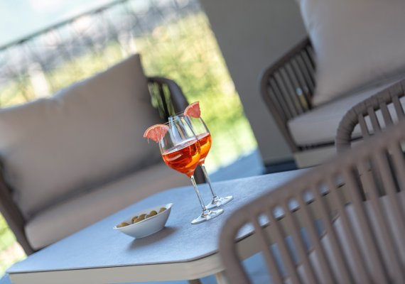 - Sonnige Terrasse mit Liegestühlen und Sitzgelegenheit
